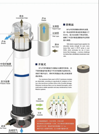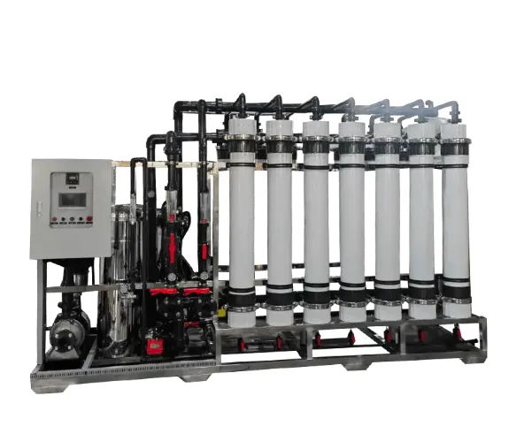 Paggamot ng tubig sa ultrafiltration ay isang teknolohiya ng paghihiwalay ng lamad sa pagitan ng microfiltration at nanofiltration. Gumagamit ito ng mga pagkakaiba-iba ng presyon bilang isang puwersa sa pagmamaneho, paggamit ng mga guwang na lamad ng hibla na may mga sukat ng butas na 0.01-0.1 μm upang makagambala sa mga colloid, bakterya, mga virus, at ilang organikong bagay sa tubig. Ang mga pangunahing bentahe nito ay: